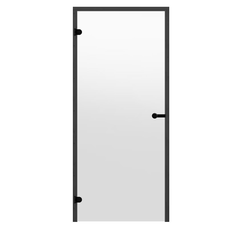 Harvias Black Line-serie sticker ut med en modern design i svart. En bastudörr med svart karm, dörrhandtag och gångjärn passar i de flesta moderna interiörer.