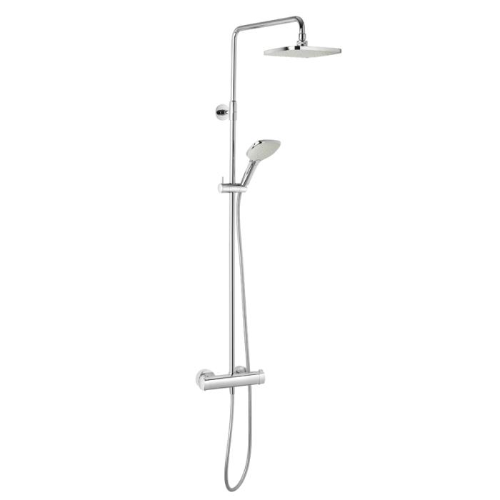 Termostaten har keramisk regleringsenhet, 1/2 anslutning för handduschslang och integrerad omskiftare för tak/handdusch. Hållaren på stången för handduschen är justerbar i höjd.