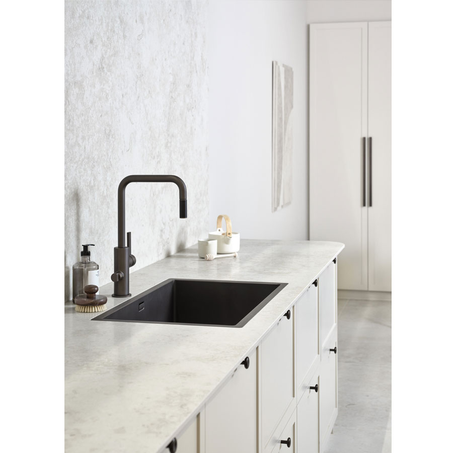 Bänkskivan är även utrustad med den exklusiva ytan Honed, en sidenmatt slipad ytfinish. Detta skapar en naturtrogen yta som inte bara känns äkta vid beröring utan också fångar ljuset på ett mjukt och elegant sätt.