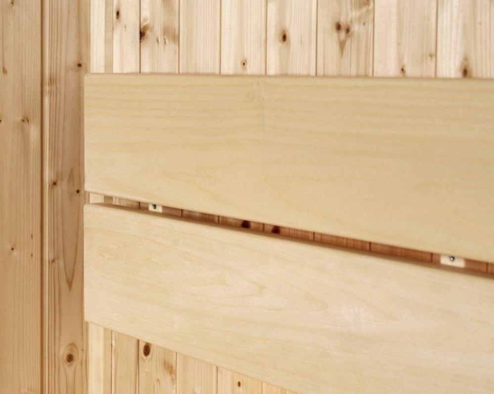 Ryggstöd Wide består av två 140mm breda brädor i asp. Kapbar, max 110mm på varje sida. Anpassad till Tylös LED-lister.