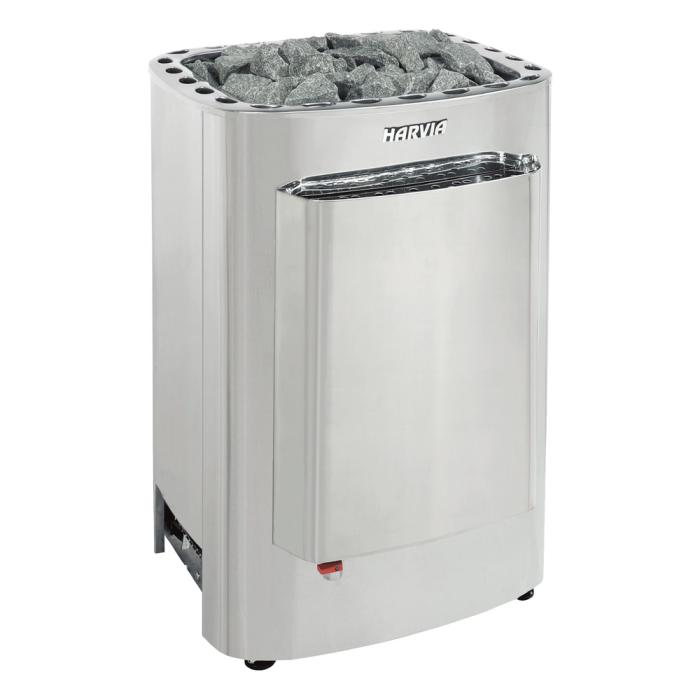 Det golvstående bastuaggregatet i stiligt stål är perfekt – det är ju ändå av världsberömd Harvia-kvalitet.