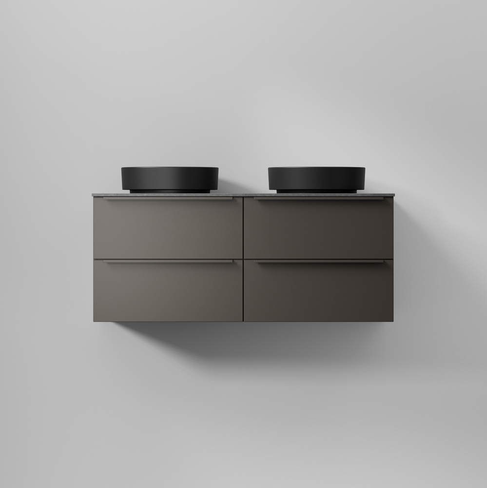 Önskar du en lösning med ett ovanpåliggande tvättställ? Kombinera Flow bänkskiva (finns i Solid Surface i vit, grå och svart) med Soak tvättställ (vit eller svart mattporslin samt Solid Surface).