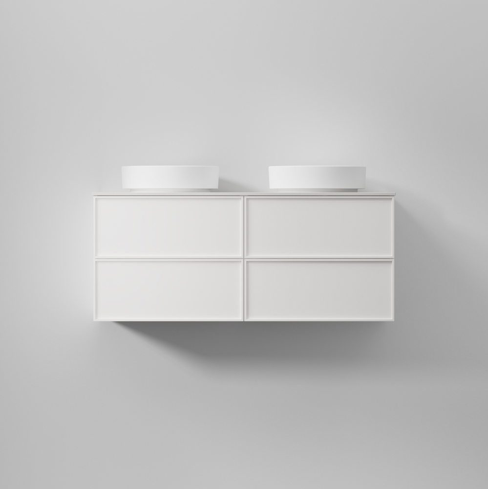 Önskar du en lösning med ett ovanpåliggande tvättställ? Kombinera Flow bänkskiva (finns i Solid Surface i vit, grå och svart) med Soak tvättställ (vit eller svart mattporslin samt Solid Surface).