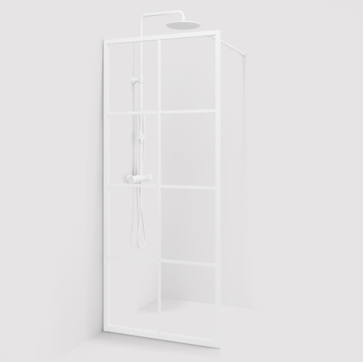Macro Design Empire Skärmvägg fast med vit spröjs i 6 mm härdat klart säkerhetsglas med en mattvit aluminiumram och spröjs som ger duschen en industriell känsla. Spröjsen är precis som profilerna tillverkade i aluminium och sitter på utsidan för enklare rengöring och kan enkelt tas bort vid städning. Denna fasta vägg har en draperiskena som är 1 meter bred som kan kapas till passande längd.