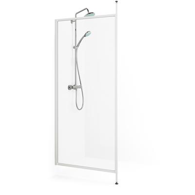 Macro Design Flow Skärmvägg fast är tillverkad i 4 mm härdat säkerhetsglas med profil runt hela glaset och ett stag som monteras upp mot taket. Väggen kan monteras på tre olika sätt. Antingen fristående så att vatten kan rinna under, med tätningslist eller tät mot golvet utan list. Takstödet har en justerbarhet till takhöjd upp till 2700 mm. Skärmväggens faktiska höjd är 1860 mm. Väggprofilen klarar rörgenomföring upp till 35 mm och vid behov kan påbyggnadsprofilen Flow SKT TR köpas till. Dessa finns i bredderna 30 och 50 mm.