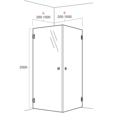 ARC 12 Original, Måttanpassad består av två öppningsbara dörrar med en maxbredd på 1000 mm. Kostnadsfri måttanpassning på höjd och bredd inom angiven intervall. A-måttet (dörr) går att få 300-1000 mm och B-måttet (dörr) går att få 300-1000 mm. Modellen är vändbar. Standardhöjd är 2000 mm ovankant glas.