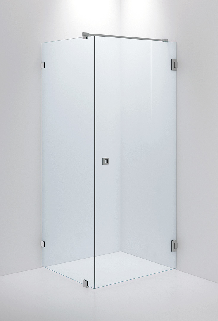 INR ARC 13 Original Hörndusch, Standardmått är en elegant hörndusch i stilren, avskalad design med 8 mm säkerhetsglas och stilrena beslag utan tätningslister och magnetlister. Den fasta väggen har beslag mellan vägg och golv som hjälper till att hålla stabiliteten i glaset. Levereras med två golvfästen om den fasta väggen är bredare än 1000 mm.