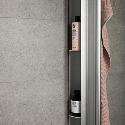 PILE är en duschförvaring som sitter monterad mellan badrumsväggen och duschprofilen. Den har 5 flyttbara hyllor för flaskor och en krok på utsidan att hänga handduken på.