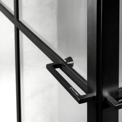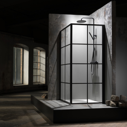 Macro Design Empire Hörndusch med svart spröjs med två öppningsbara dörrar i 6 mm härdat klart säkerhetsglas med en mattsvart aluminiumram och spröjs som ger duschen en industriell känsla. Spröjsen är precis som profilerna tillverkade i svartanodiserad aluminium och sitter på utsidan för enklare rengöring och kan enkelt tas bort vid städning. Duschdörrarna till Empire hörndusch med spröjs har handtag som även de är mattsvarta. Dörrarna i Empire Hörndusch kan öppnas hela vägen utåt och inåt vilket underlättar vid till exempel städning.