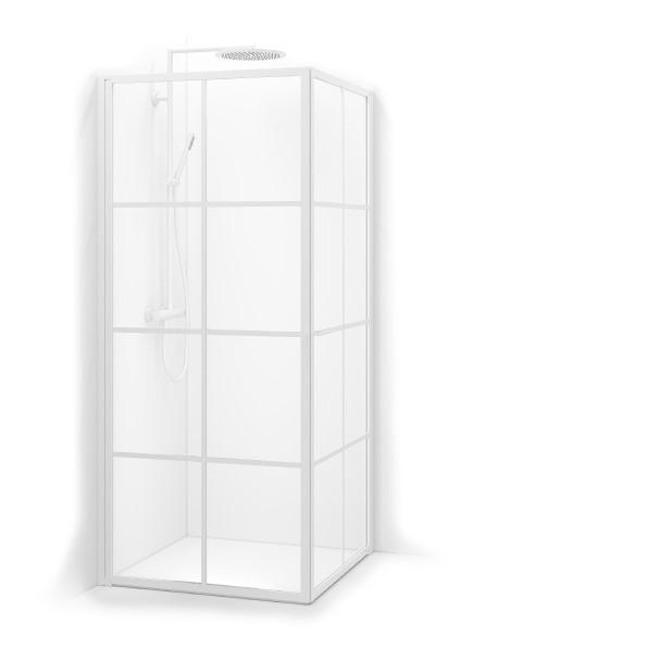 Macro Design Empire Hörndusch med vit spröjs med två öppningsbara dörrar i 6 mm härdat klart säkerhetsglas med en mattvit aluminiumram och spröjs som ger duschen en industriell känsla. Spröjsen är precis som profilerna tillverkade i aluminium och sitter på utsidan för enklare rengöring och kan enkelt tas bort vid städning. Duschdörrarna till Empire hörndusch med spröjs har handtag som även de är mattvita. Dörrarna i Empire Hörndusch kan öppnas hela vägen utåt och inåt vilket underlättar vid till exempel städning.