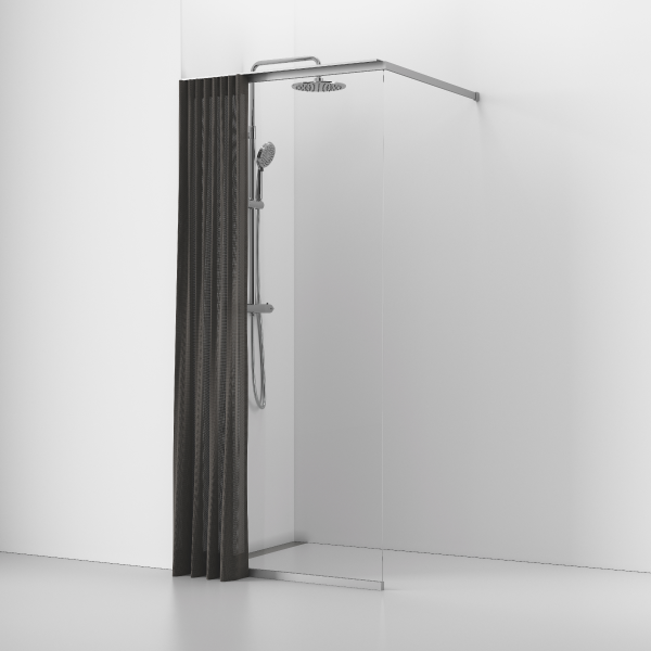 Kombinera din Langfoss skärmvägg med ett textilgardin för att skärma av duschutrymmet, ge insynsskydd och ge badrummet en mjukare och lyxigare känsla. Gardinen absorberar ljud men är också praktiskt och snyggt. Gardinen hänger på utsidan av glasväggen och kan skjutas fram och tillbaka i gardinskena som köps separat.
