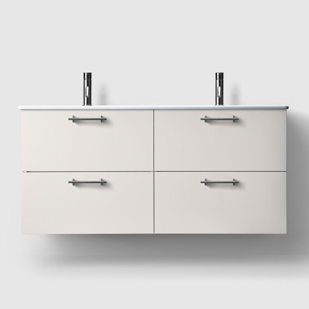Haven H3 Kommod 120 dubbeltvättställ. Underskåpet har fyra lådor med släta lackerade lådfronter. Lådorna har mjukstängande skenor vilket gör att lådorna glider lätt och stängs tyst. I möbeln ingår ett eluttag som är monterat i den ena nedre lådan. Lådorna har perforerade innersidor i lackerad plåt. Det ingår ett startkit med sex praktiska förvaringsaskar som man enkelt kan lyfta upp. Materialet i dessa askar är tillverkade i 100% nedbrytningsbart material. Skåpsstommen och lådfronterna är lackerade i miljövänlig lack av högsta kvalitet.