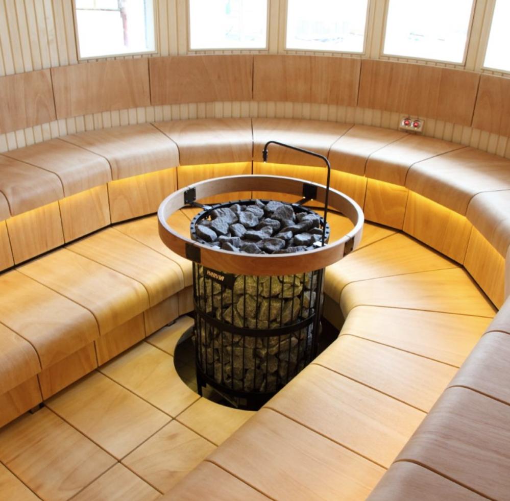 Aggregatorns runda design gör det möjligt att installera den centralt i bastun eller integrerad i bastulaven — perfekt både för hemmabastun och för offentliga/publik bastu-anläggningar.