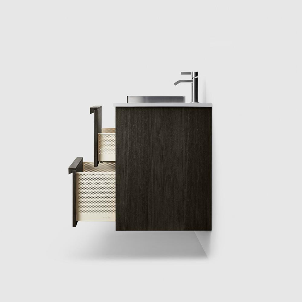 H2 serie är badrumsmöbler i äkta trä designat av Note Design Studio. Möbler sticker ut med miljövänlig ytbehandling, robusta detaljer med minimalt behandlat trä och tillbehör som alltid ingår. Detta kommod finns med porslinstvättställ alternativt med bänkskiva och nedsänkt eller underlimmat handfat. För aktuellt tvättställ/skiva se den andra bilden.