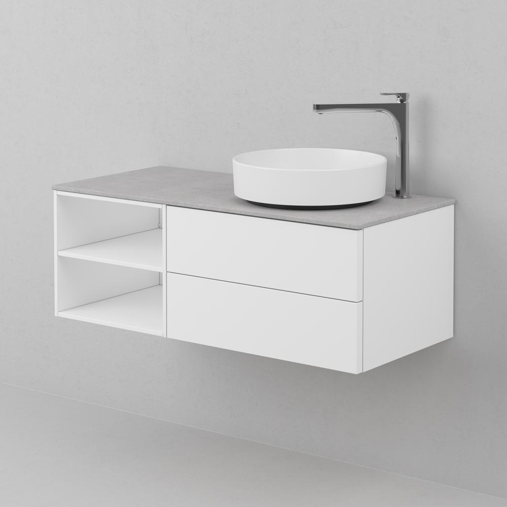 Minimalistiska AIR Solid med sin touch av vardagsrumsmöbel ger en skön och luftig känsla till badrummet. Det vackert formgivna tvättstället med avsmalnad botten skapar ett vackert skuggspel mot bänkskivan i kvartskomposit.