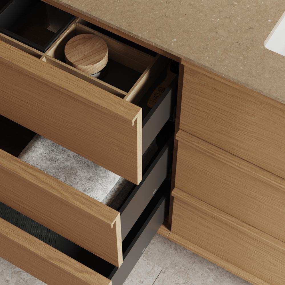 Om du har väggavlopp kan du välja tillvalet Plus Storage som ger dig en 5 cm djupare nedre låda och därmed rymligare förvaring. Organisera din förvaring med Plus Divider. Finns som förvaringsinsats för övre och mittersta samt nedre låda.