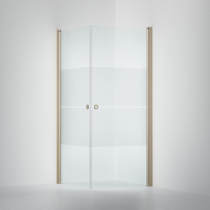 Duschhörna med två raka, invikningsbara dörrar i 6 mm glas. Finns i fasta standardmått som du kan kombinera fritt men också i måttanpassat utförande. Kombinera med PILE.