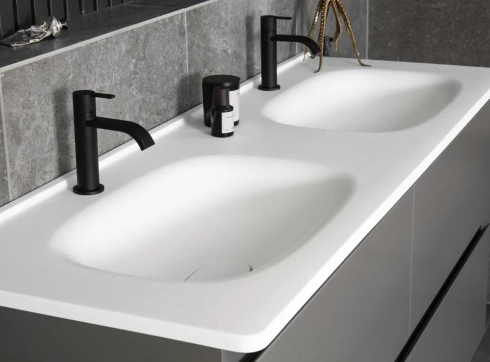 Vedum Flow kommod 1500 med Top Solid och dubbelho. Tvättstället har en yta av Top Solid. Underskåp med låda/lådor och greppkant.