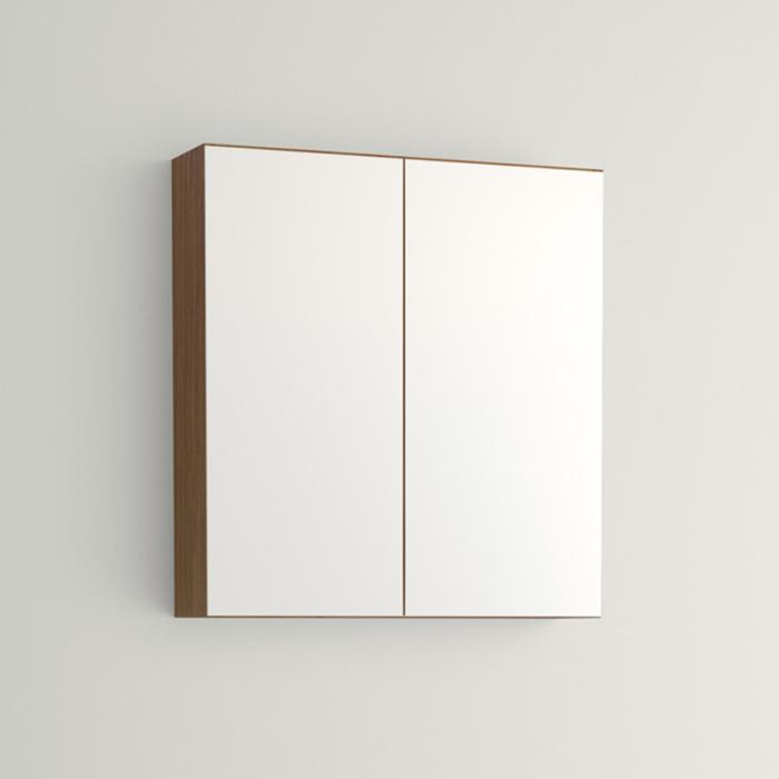 Vedum Spegelskåp Plus 600 med två speglar och LED-belysning har dubbelsidiga speglar med dämpning i gångjärnet. Inne i skåpet sitter två flyttbara glashyllor.