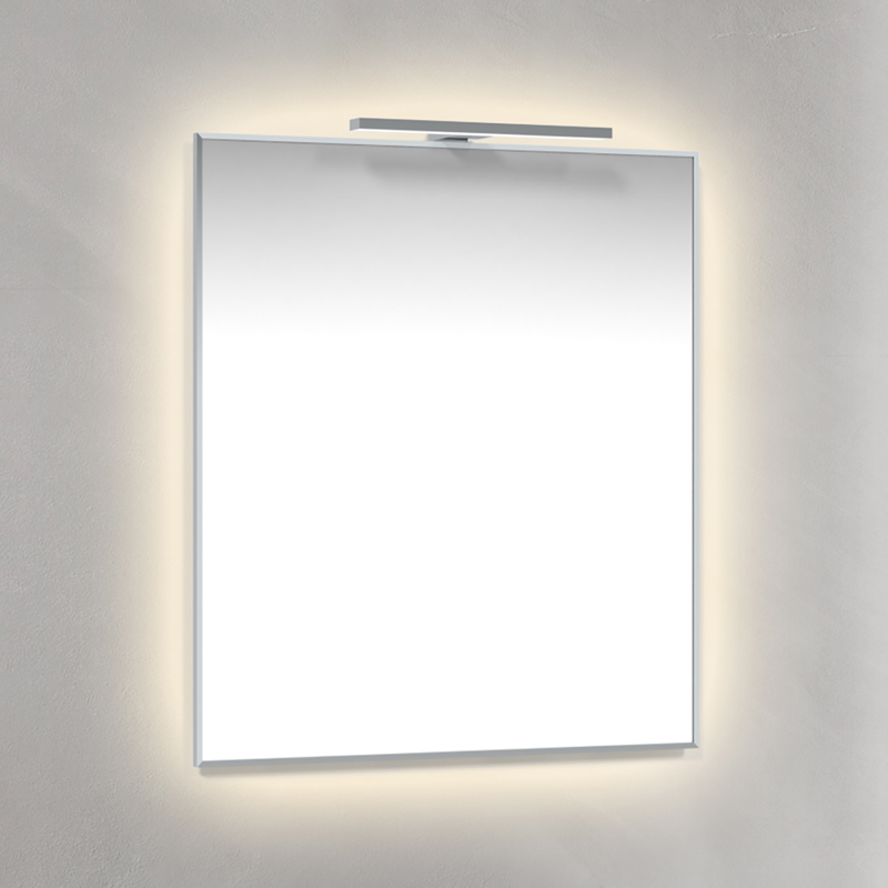 Macro Design Spegel med ram och T-belysning LED. Denna spegel har en LED-belysning som sitter ovanför spegeln. Spegeln går att få i olika bredder och du kan välja modellen med bakomliggande belysning Ambilight som ger en snygg effektbelysning. Ramen runt spegeln är kromad. Välj mella olika bredder på spegeln.