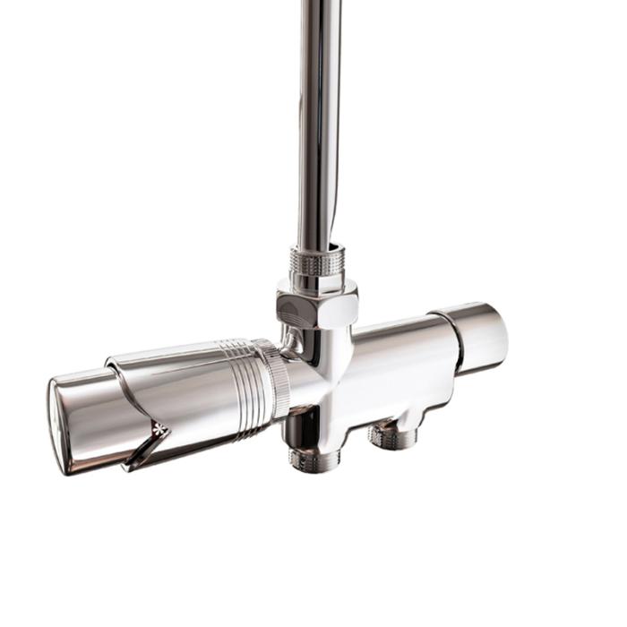 En NH-ventil som är snyggt designad för att smälta samman med handdukstorken till en helhet. Det är en termostatventil som känner av rummets temperatur.
