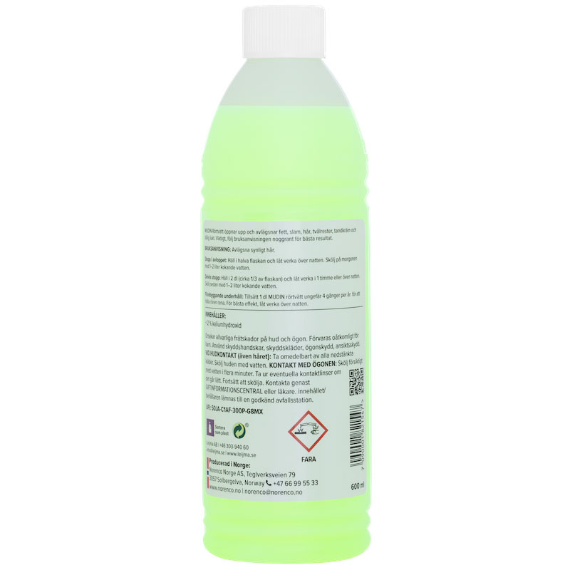 BRUKSANVISNING: Koka upp 4 dl vatten, tillsätt sedan 2 dl MUDIN Rörtvätt i det varma vattnet innan blandningen hälls i avloppet. Använd alltid dubbelt så mycket vatten som MUDIN Rörtvätt om rören kräver mer volym. Verkningstiden är 30 minuter till maximalt 1 timma. Skölj efter rikligt med varmt vatten. Rekommenderas att ta bort synligt hår i avloppet först!