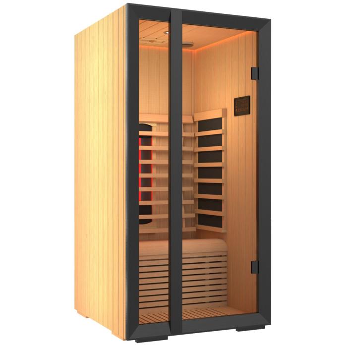 - Kompakt design: Mått på 1300 x 1043 x 2000 mm med en högerhängd dörr, vilket ger en idealisk fördelning av den infraröda strålningen (A 5%, B 24%, C 71%).