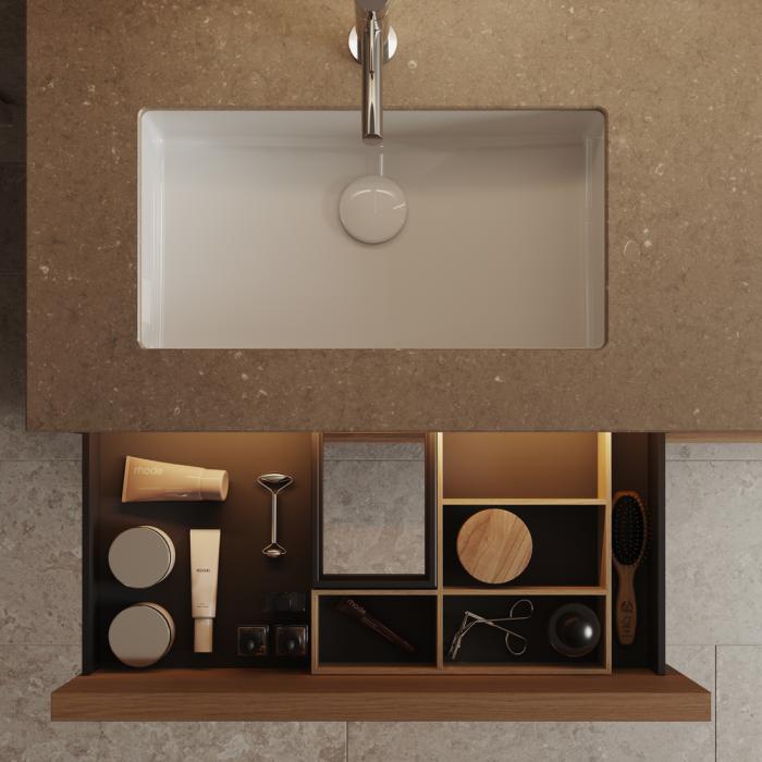 • Flexibla tvättställsalternativ: Välj mellan det solida tvättstället Smooth i solid surface, porslinstvättställ i olika höjder eller bänkskiva med ovanpåliggande tvättställ.