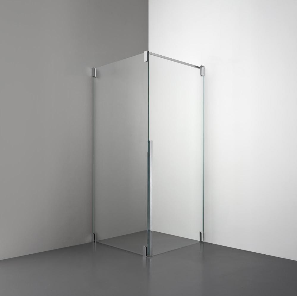 Denna modell kombinerar en fast glasvägg med en rak öppningsbar dörr i 8 mm glas.