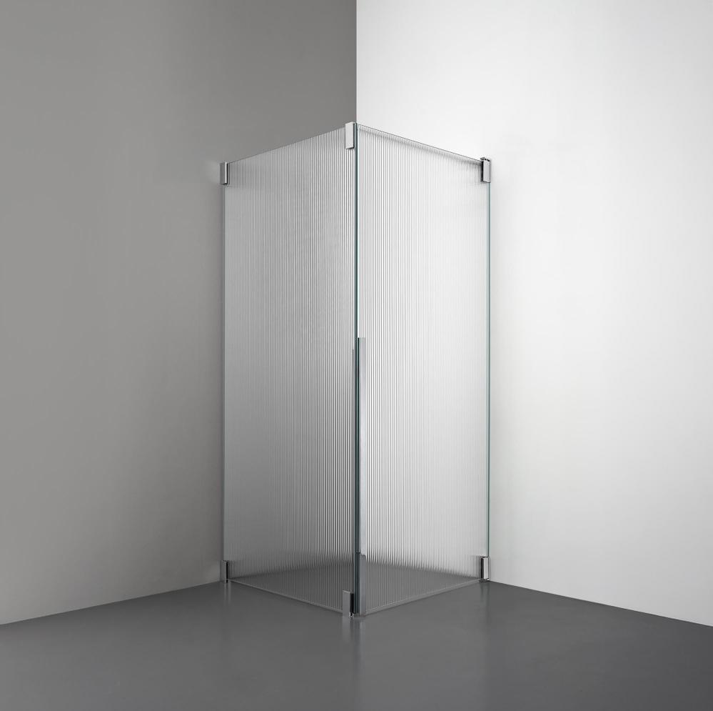 Denna modell kombinerar en fast glasvägg med en rak öppningsbar dörr i 8 mm glas.