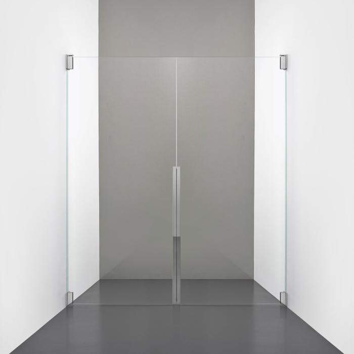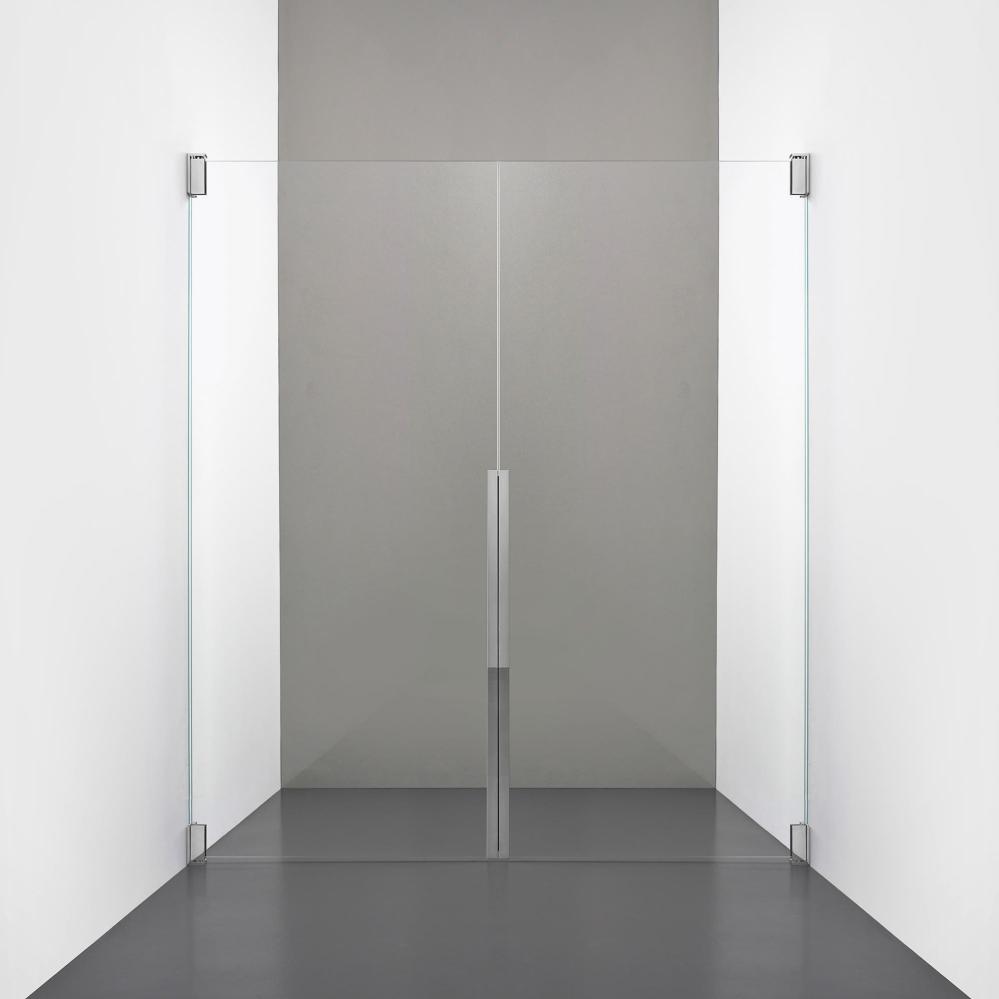 Två raka dörrar i 8 mm glas möts i en central öppning, vilket maximerar instegsytan.