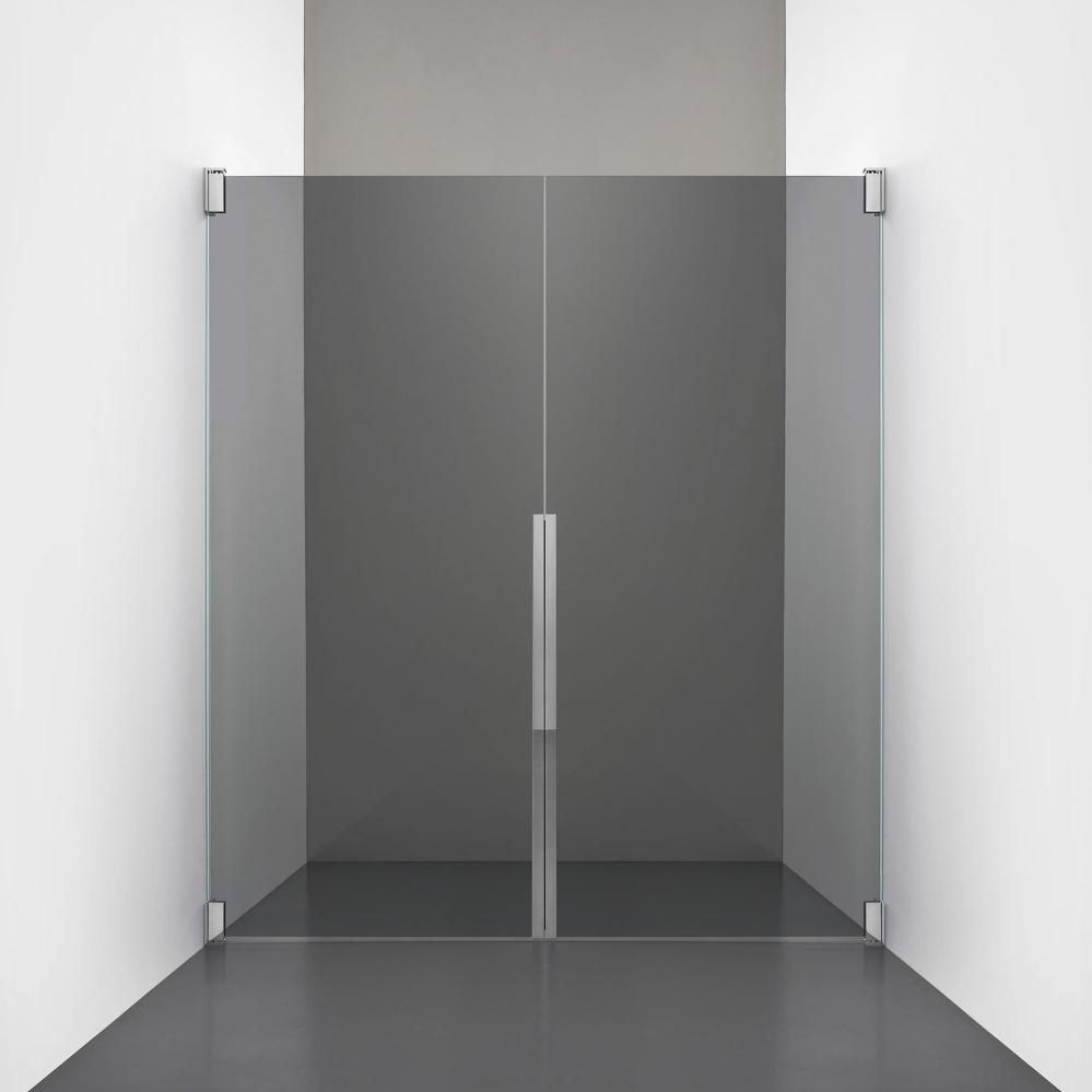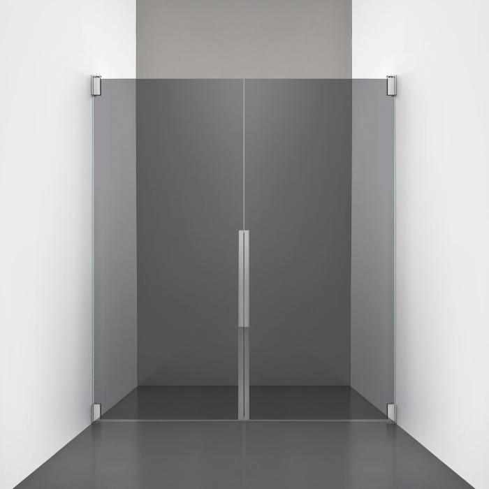 Två raka dörrar i 8 mm glas möts i en central öppning, vilket maximerar instegsytan.