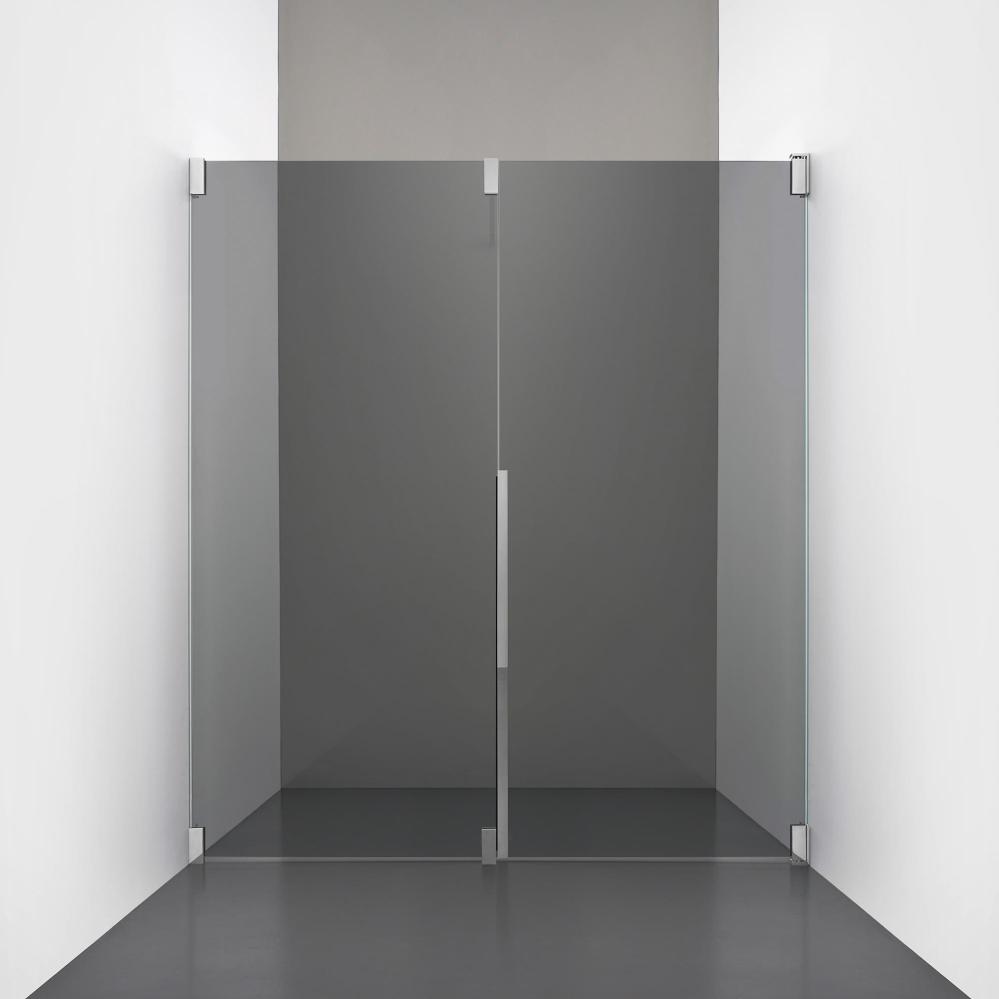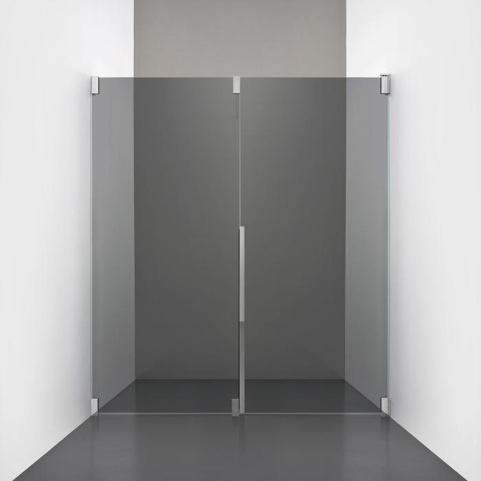 Den fasta väggen bidrar till konstruktionens stabilitet, medan den öppningsbara delen möjliggör en generös duschingång. Handtaget integreras direkt i glaset och kompletteras med eleganta beslag i massiv mässing.