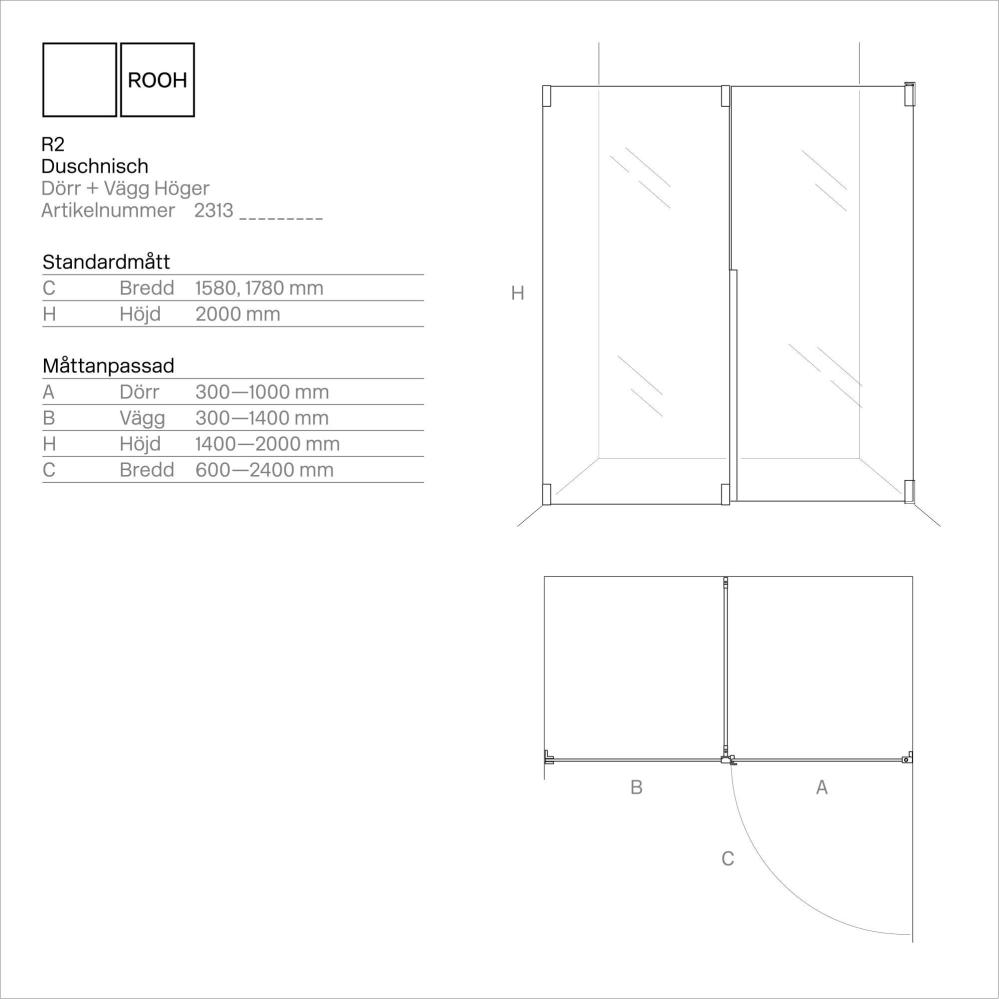 R2 är en exklusiv serie duschlösningar, där sofistikerade detaljer skapar en känsla av harmoni. Välj mellan flera olika glas och kombinera med stora utbud av beslagsfärger. Alla ROOH duschväggar tillverkas lokalt i halländska Oskarström. Kvalitet och hållbarhet genomsyrar utveckling och produktion av produkter.
