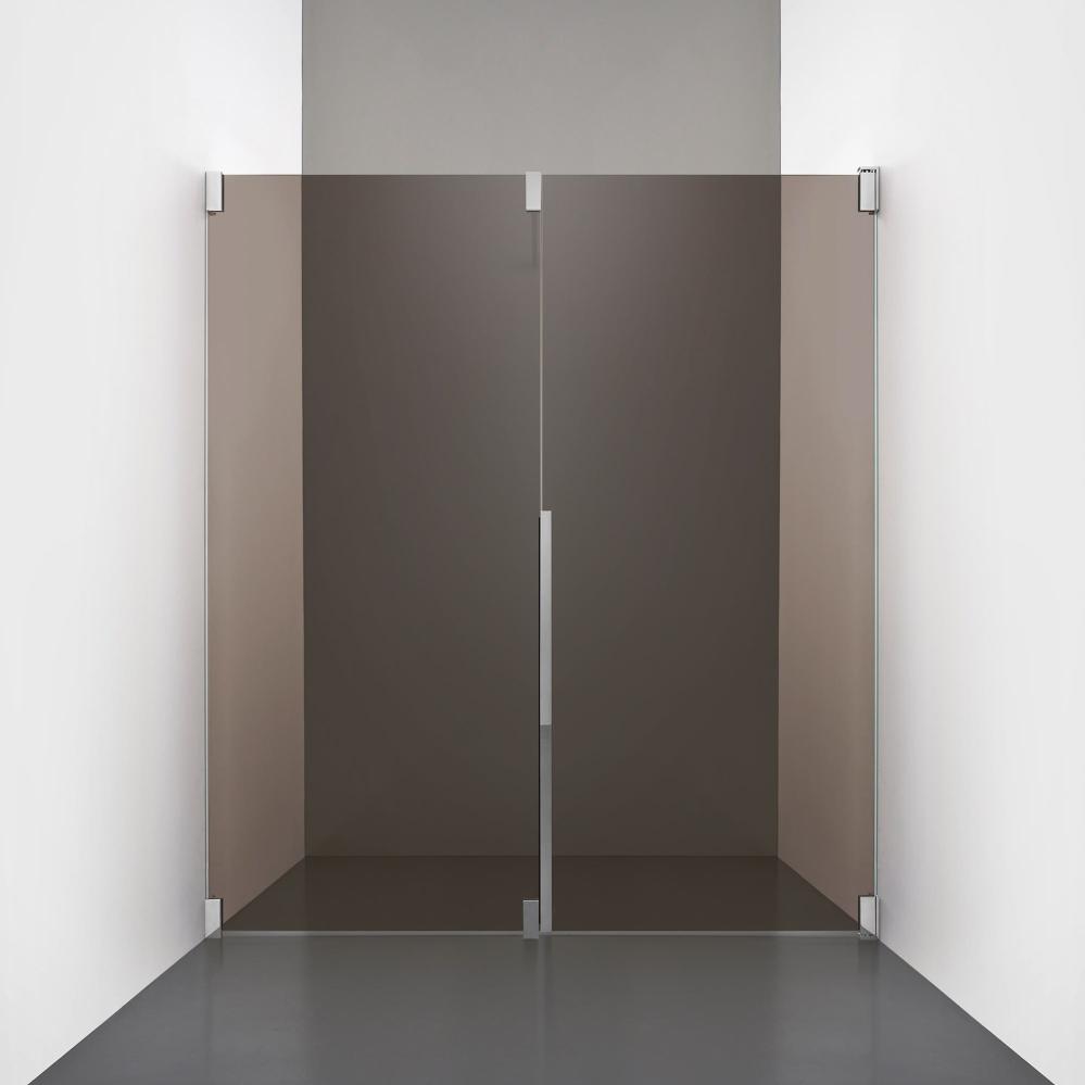 Den fasta väggen bidrar till konstruktionens stabilitet, medan den öppningsbara delen möjliggör en generös duschingång. Handtaget integreras direkt i glaset och kompletteras med eleganta beslag i massiv mässing.