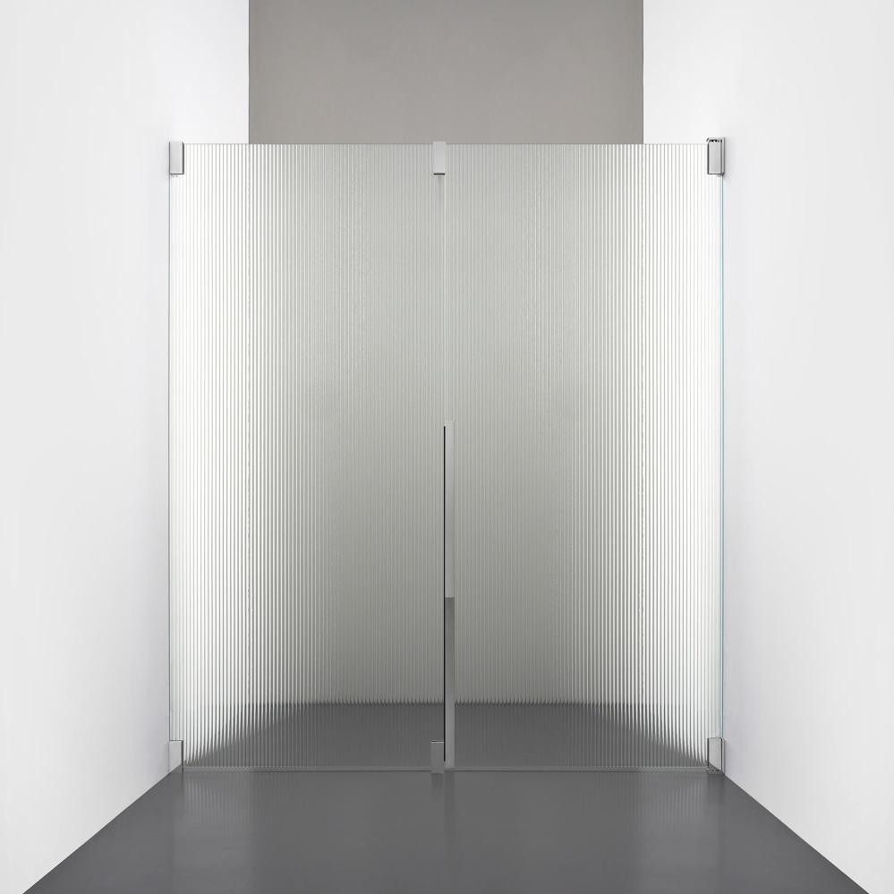 Den fasta väggen bidrar till konstruktionens stabilitet, medan den öppningsbara delen möjliggör en generös duschingång. Handtaget integreras direkt i glaset och kompletteras med eleganta beslag i massiv mässing.