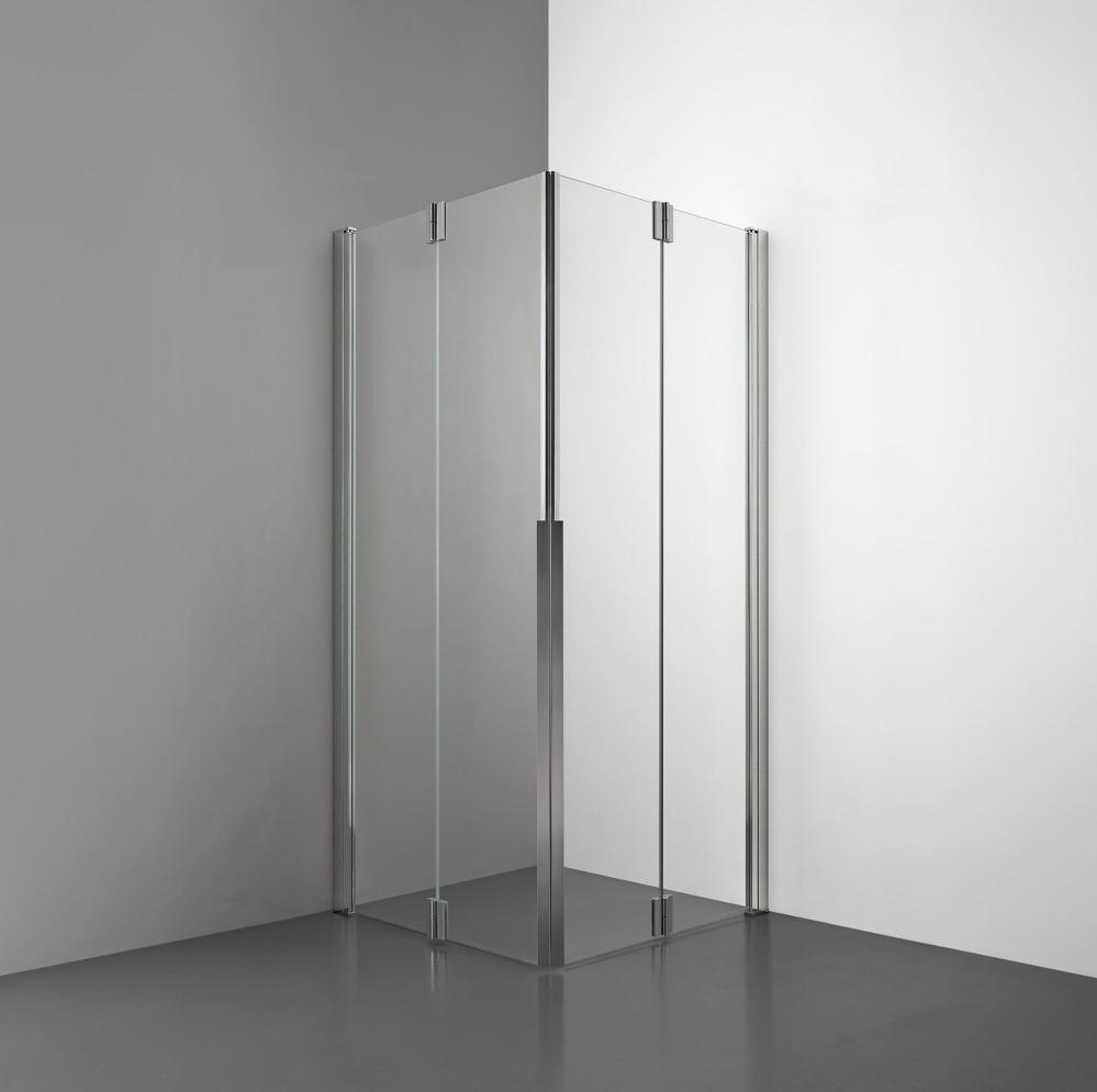 Denna lösning med två vikbara dörrar i 6 mm glas erbjuder stor flexibilitet i små badrum. När dörrarna fälls inåt frigörs extra golvyta, samtidigt som en modern design med diskreta aluminiumdetaljer säkerställer ett enhetligt intryck.