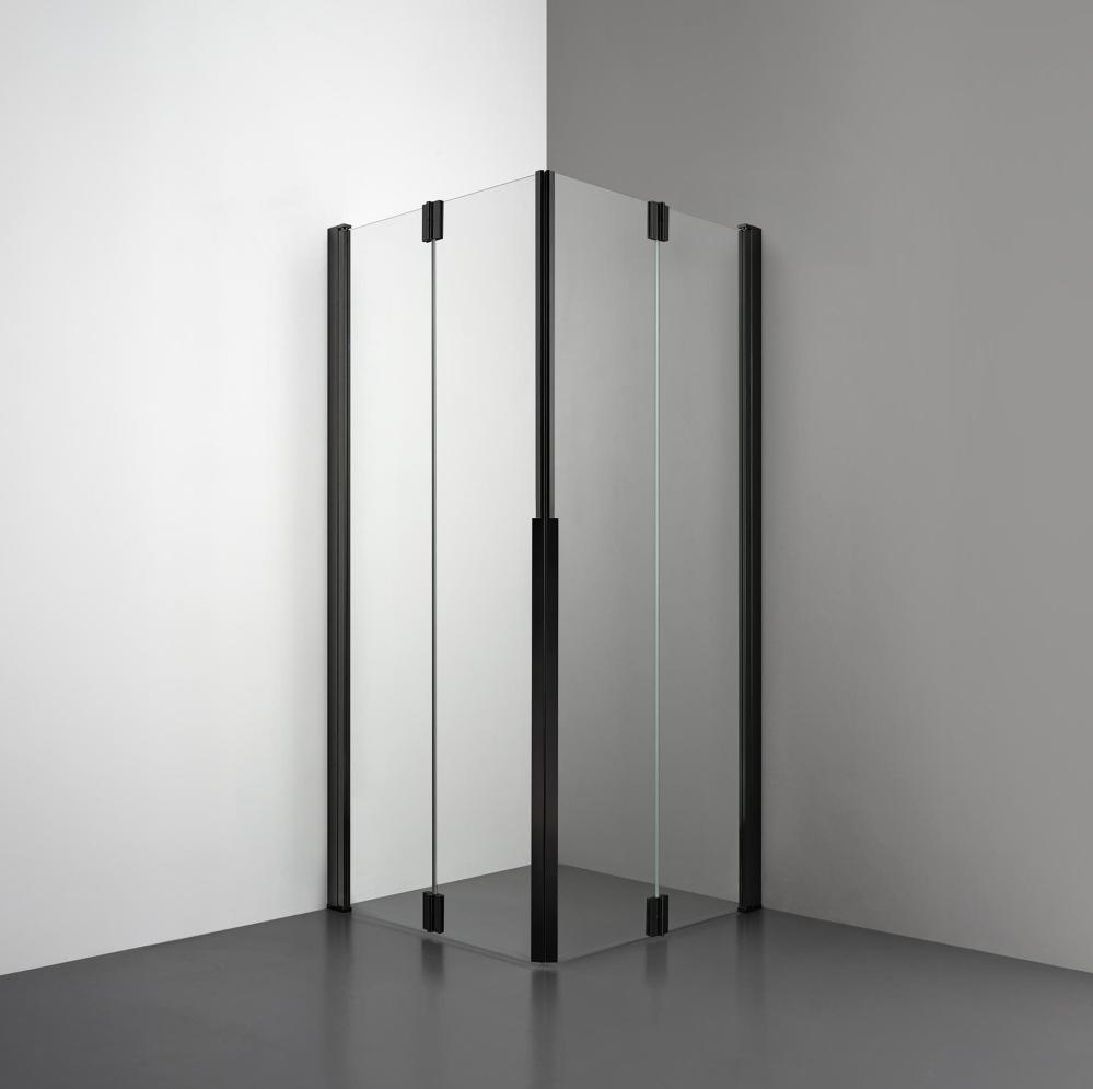 Denna lösning med två vikbara dörrar i 6 mm glas erbjuder stor flexibilitet i små badrum. När dörrarna fälls inåt frigörs extra golvyta, samtidigt som en modern design med diskreta aluminiumdetaljer säkerställer ett enhetligt intryck.