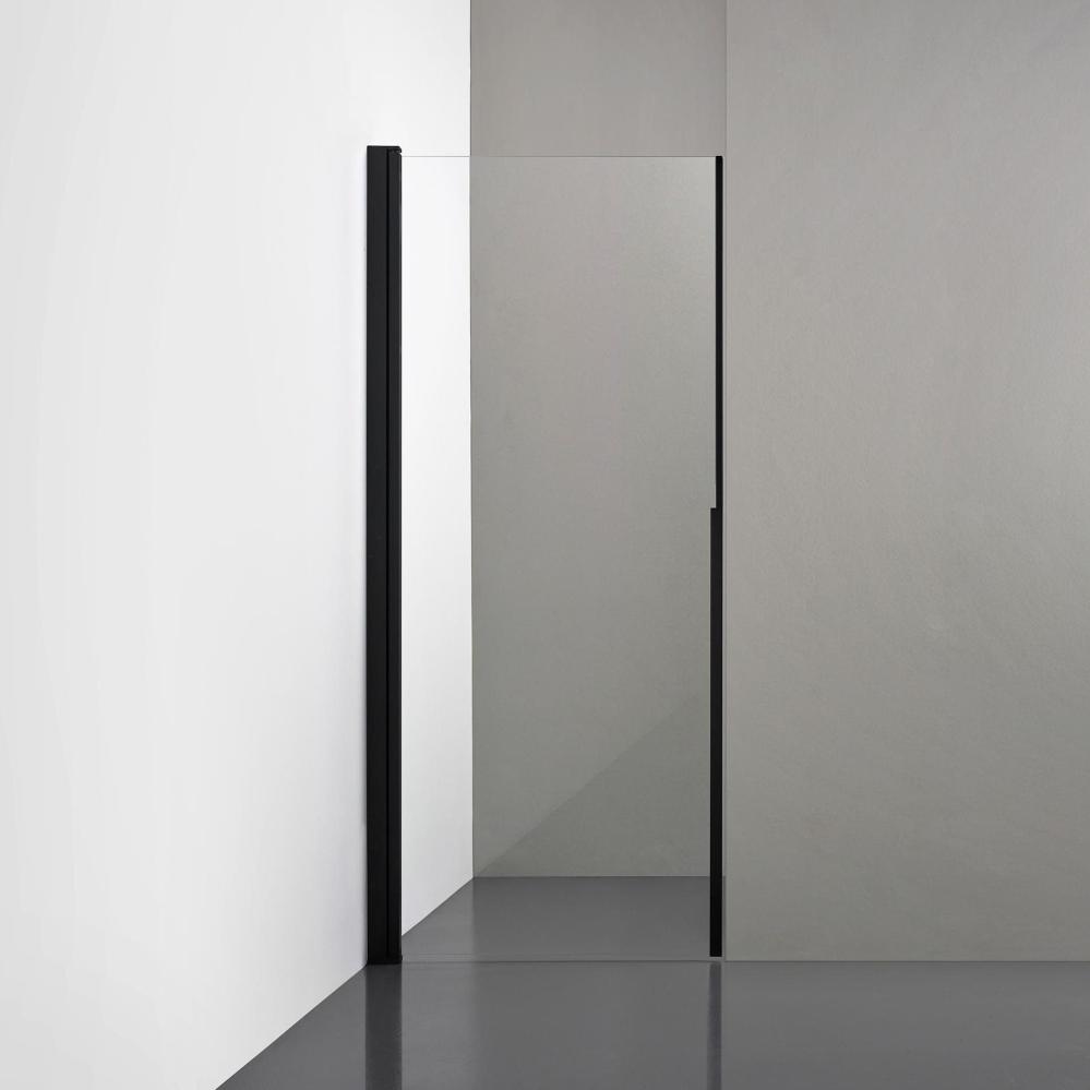 En enkel nischdörr i 6 mm glas med en diskret aluminiumprofil mot vägg och integrerad magnetlist, utformad för att skapa en välavgränsad duschzon mellan två väggar.