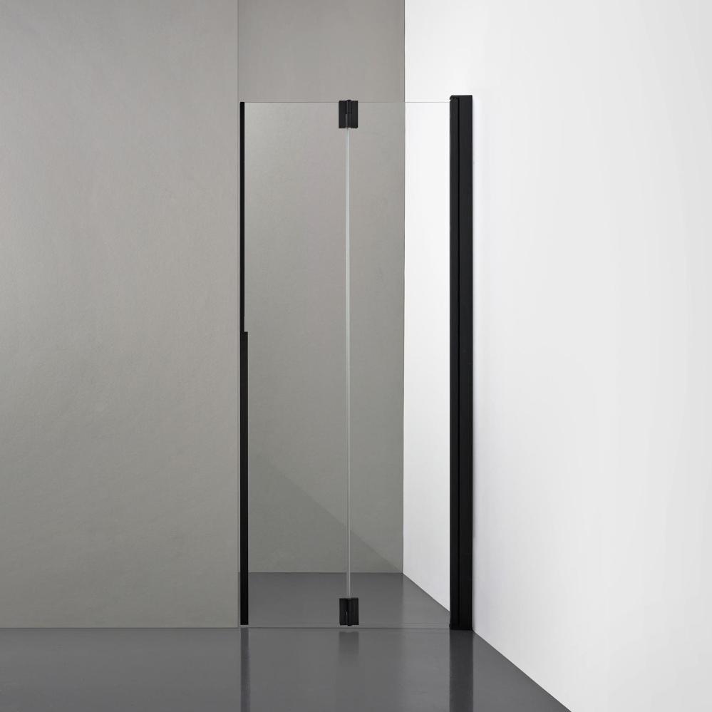 En enskild vikdörr i 6 mm glas som monteras i en nisch, vilket omvandlar en standardnisch till en elegant duschlösning med integrerad magnetlist, särskilt anpassad för platsbesparande installation.