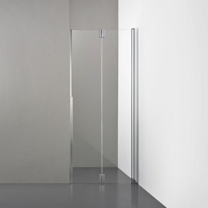 En enskild vikdörr i 6 mm glas som monteras i en nisch, vilket omvandlar en standardnisch till en elegant duschlösning med integrerad magnetlist, särskilt anpassad för platsbesparande installation.