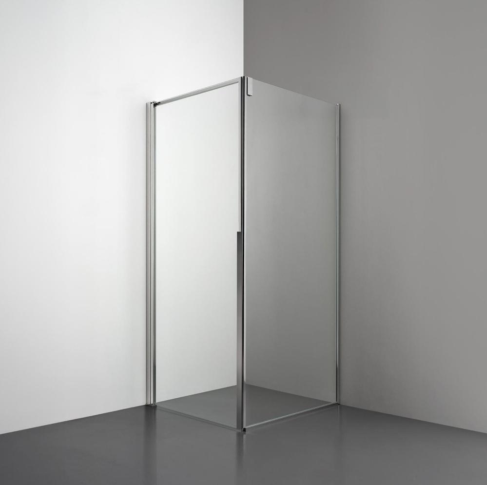 Denna modell kombinerar en fast glasvägg med en rak dörr i 6 mm glas. Lösningen skapar en stilren och öppen hörnupplevelse med integrerade magnetlister, vilket säkerställer en tät stängning och elegant övergång mellan fast och rörlig sektion.