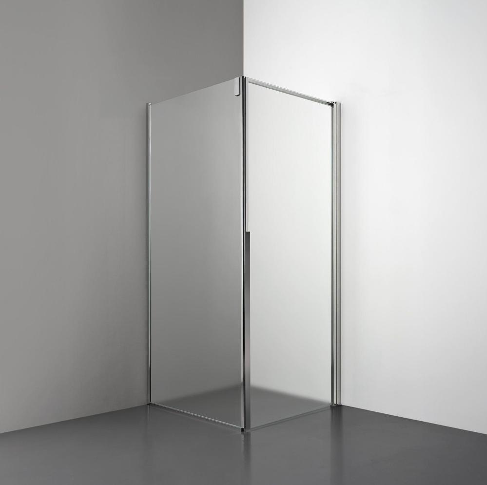 Denna modell kombinerar en fast glasvägg med en rak dörr i 6 mm glas. Lösningen skapar en stilren och öppen hörnupplevelse med integrerade magnetlister, vilket säkerställer en tät stängning och elegant övergång mellan fast och rörlig sektion.