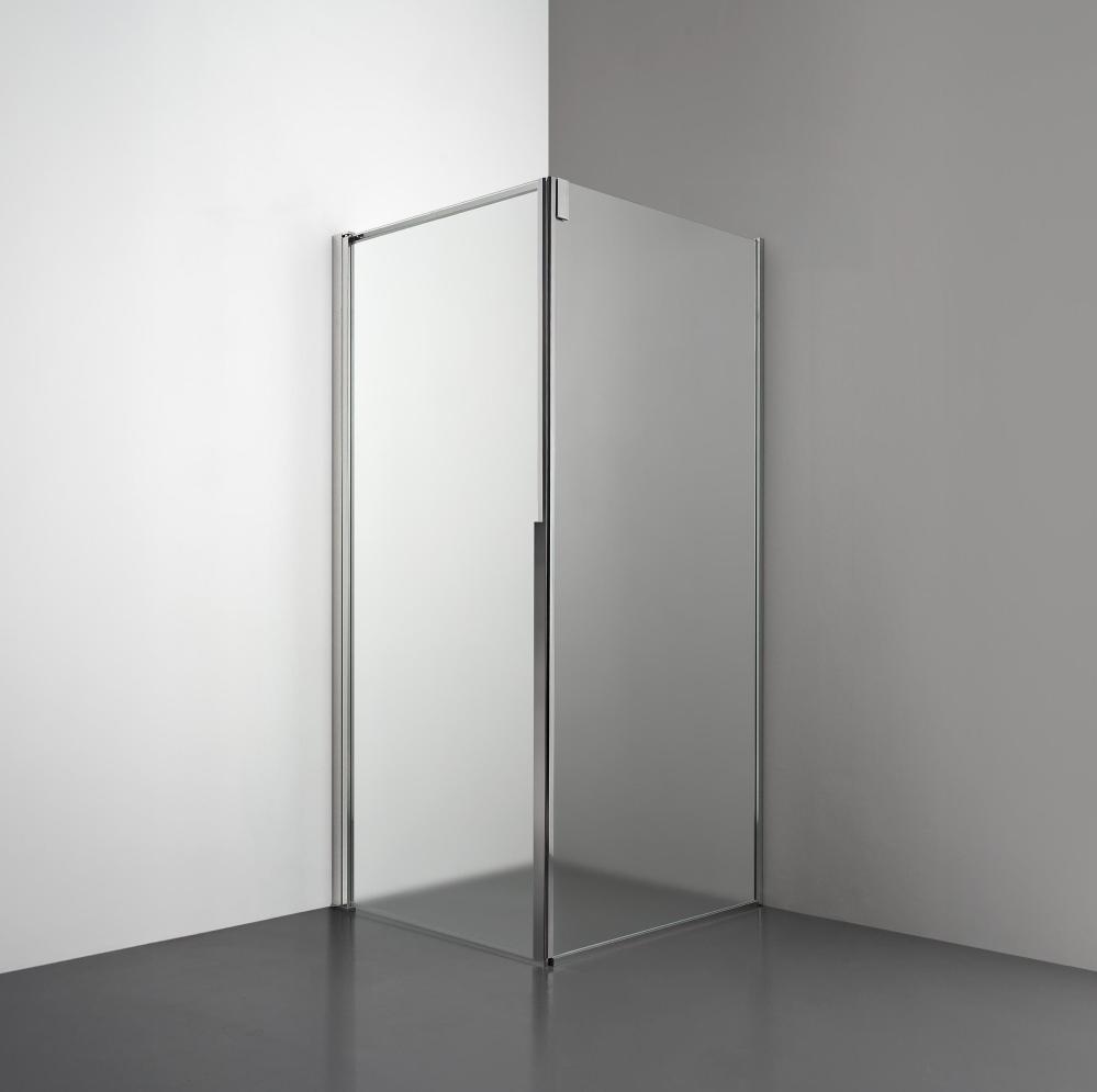 Denna modell kombinerar en fast glasvägg med en rak dörr i 6 mm glas. Lösningen skapar en stilren och öppen hörnupplevelse med integrerade magnetlister, vilket säkerställer en tät stängning och elegant övergång mellan fast och rörlig sektion.