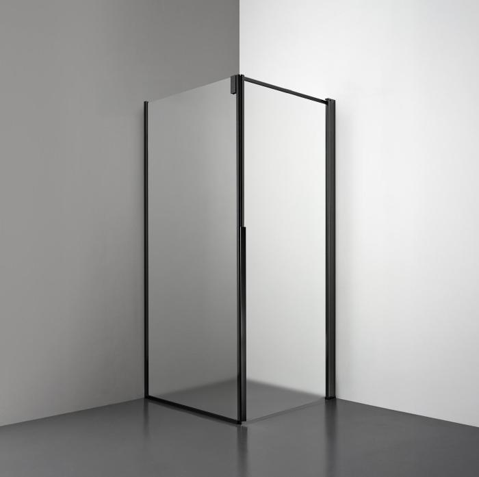 Denna modell kombinerar en fast glasvägg med en rak dörr i 6 mm glas. Lösningen skapar en stilren och öppen hörnupplevelse med integrerade magnetlister, vilket säkerställer en tät stängning och elegant övergång mellan fast och rörlig sektion.
