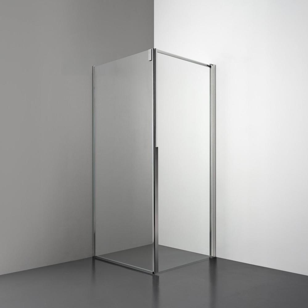 Denna modell kombinerar en fast glasvägg med en rak dörr i 6 mm glas. Lösningen skapar en stilren och öppen hörnupplevelse med integrerade magnetlister, vilket säkerställer en tät stängning och elegant övergång mellan fast och rörlig sektion.