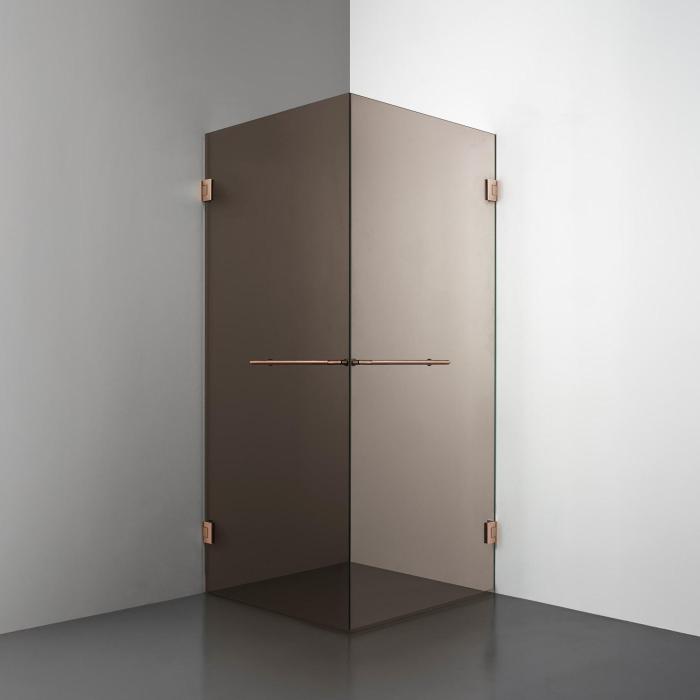 Den här modellen erbjuder två raka duschdörrar i 8 mm glas som möts i en hörna. Lösningen utstrålar lyx och modernitet - med möjlighet att välja mellan olika handtagsalternativ - vilket gör den till en stark kandidat för badrum som kräver en stor ingångsyta och en exklusiv design.