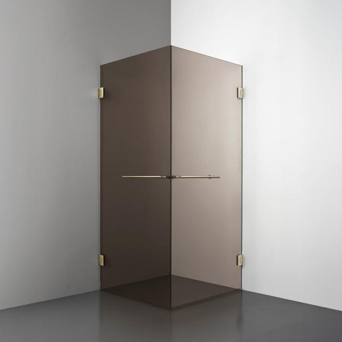 Den här modellen erbjuder två raka duschdörrar i 8 mm glas som möts i en hörna. Lösningen utstrålar lyx och modernitet - med möjlighet att välja mellan olika handtagsalternativ - vilket gör den till en stark kandidat för badrum som kräver en stor ingångsyta och en exklusiv design.