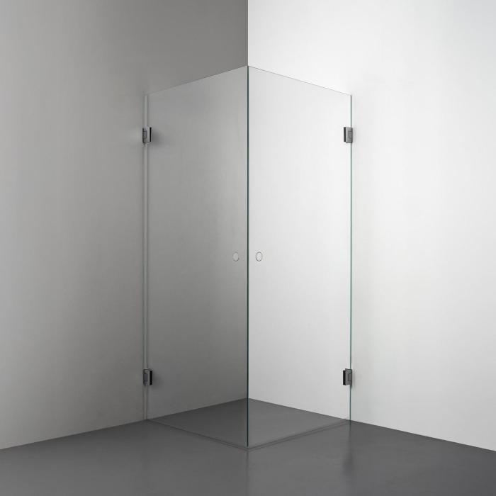 Den här modellen erbjuder två raka duschdörrar i 8 mm glas som möts i en hörna. Lösningen utstrålar lyx och modernitet - med möjlighet att välja mellan olika handtagsalternativ - vilket gör den till en stark kandidat för badrum som kräver en stor ingångsyta och en exklusiv design.