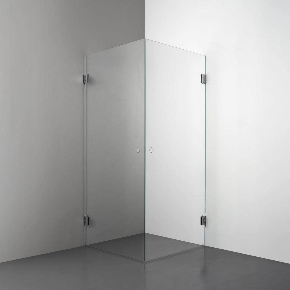 Den här modellen erbjuder två raka duschdörrar i 8 mm glas som möts i en hörna. Lösningen utstrålar lyx och modernitet - med möjlighet att välja mellan olika handtagsalternativ - vilket gör den till en stark kandidat för badrum som kräver en stor ingångsyta och en exklusiv design.
